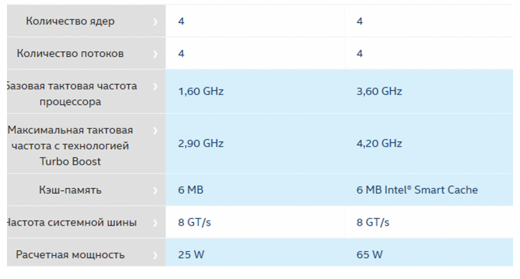 В таблице сравнения характеристик INTEL, мы сразу видим два главных отличия между ними! Во-первых, у ноутбучного варианта занижена как базовая, так и частота в режиме турбобуст. (А это одна из важнейших характеристик, которая определяет производительность процессора!). Во-вторых, расчетная тепловая мощность (TDP) отличается более чем в два раза! (Этот параметр определяет сколько тепла производит процессор в процессе работы).